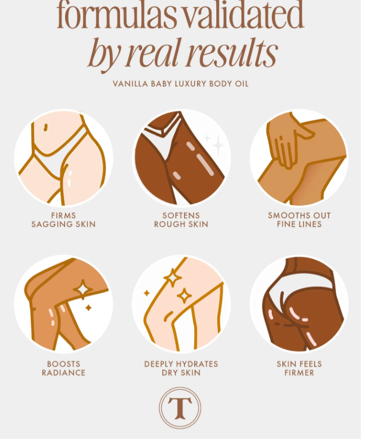 ¿Buscas esa piel que parece brillar desde adentro? Vanilla Baby es el lujo embotellado. Este aceite corporal premium combina una hidratación profunda con nuestra fragancia más icónica: una vainilla cálida, dulce y reconfortante que se funde en tu piel para un aroma que dura horas.